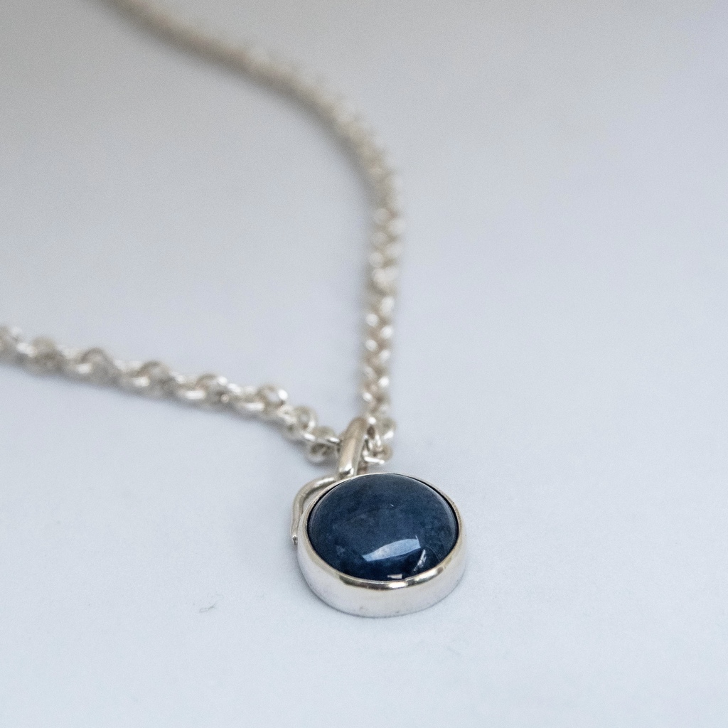 El dije esta hecho en plata 925, la piedra es un cuarzo azul, el tamaño aproximado es de 1,5 cm de diámetro.