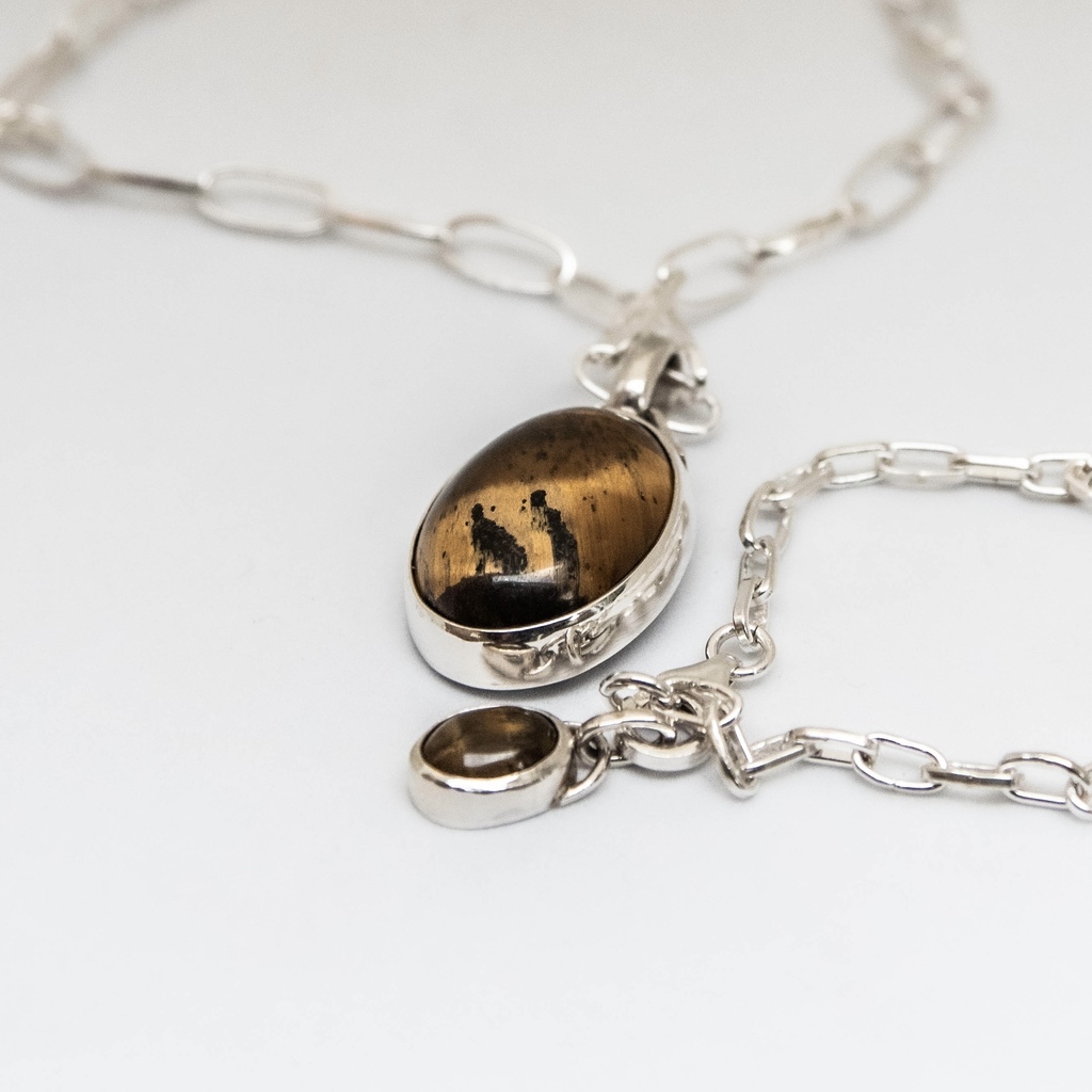 El dije esta hecho en plata 925, la piedra es un ojo de tigre, el tamaño aproximado es de 2 cm x 2,5 cm.